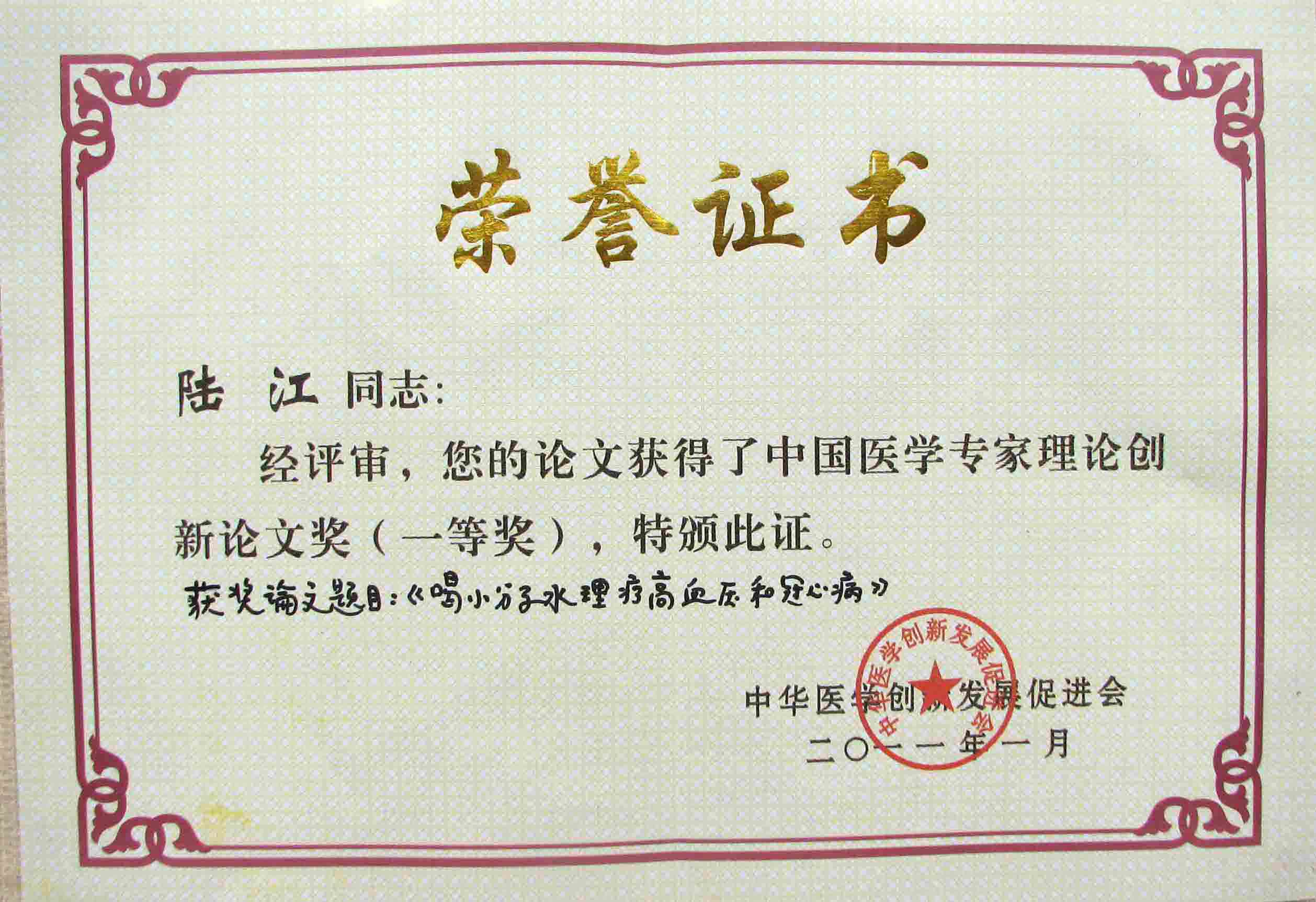 新疆63歲的賀兆生飲用一年,冠心病未愈,他用電話介紹是食堂管理員,問他食量多少?說(shuō)吃七八分飽,睡前還吃兩袋牛奶,陸 江說(shuō)我在論文和書中多次批判“吃七八分飽”,關(guān)照患者務(wù)必用“己饑方食”控制主食肉食量,要他把牛奶改在早中餐吃,減少主食肉食量,建議不吃晩餐,晚上只吃一個(gè)蘋果,再經(jīng)幾個(gè)月補(bǔ)水節(jié)食,治愈了21年的冠心病和肥胖、失眠等病,信中由衷地感激陸 江為再生父母。[13]因?yàn)獒t(yī)生從未過問他的膳食習(xí)慣,只管開處方藥或手術(shù),父母也不會(huì)叫他不吃晩飯。