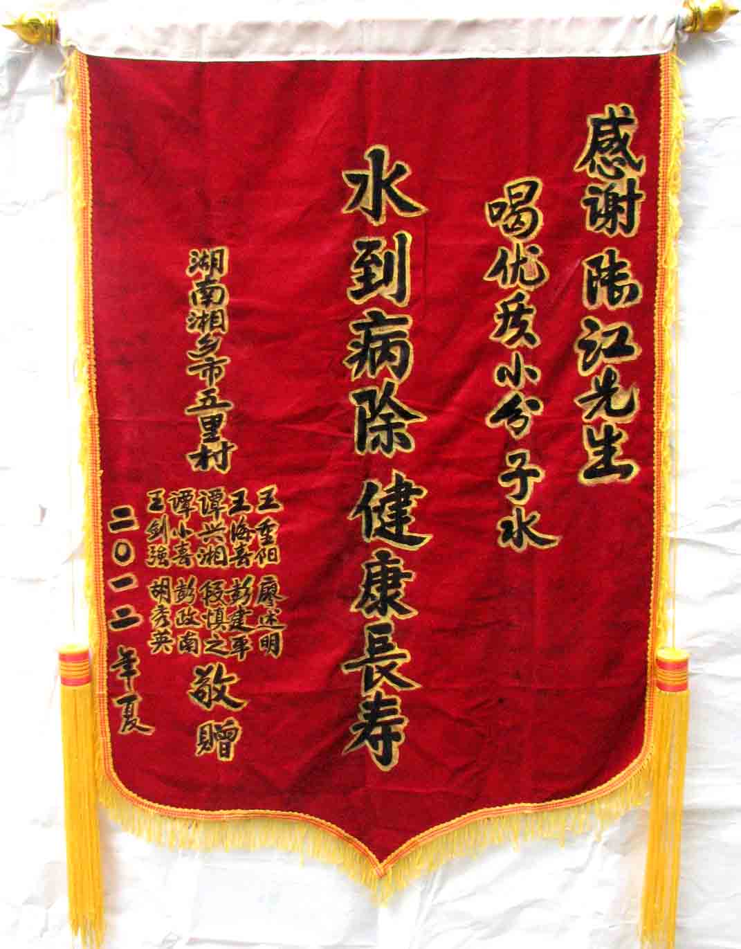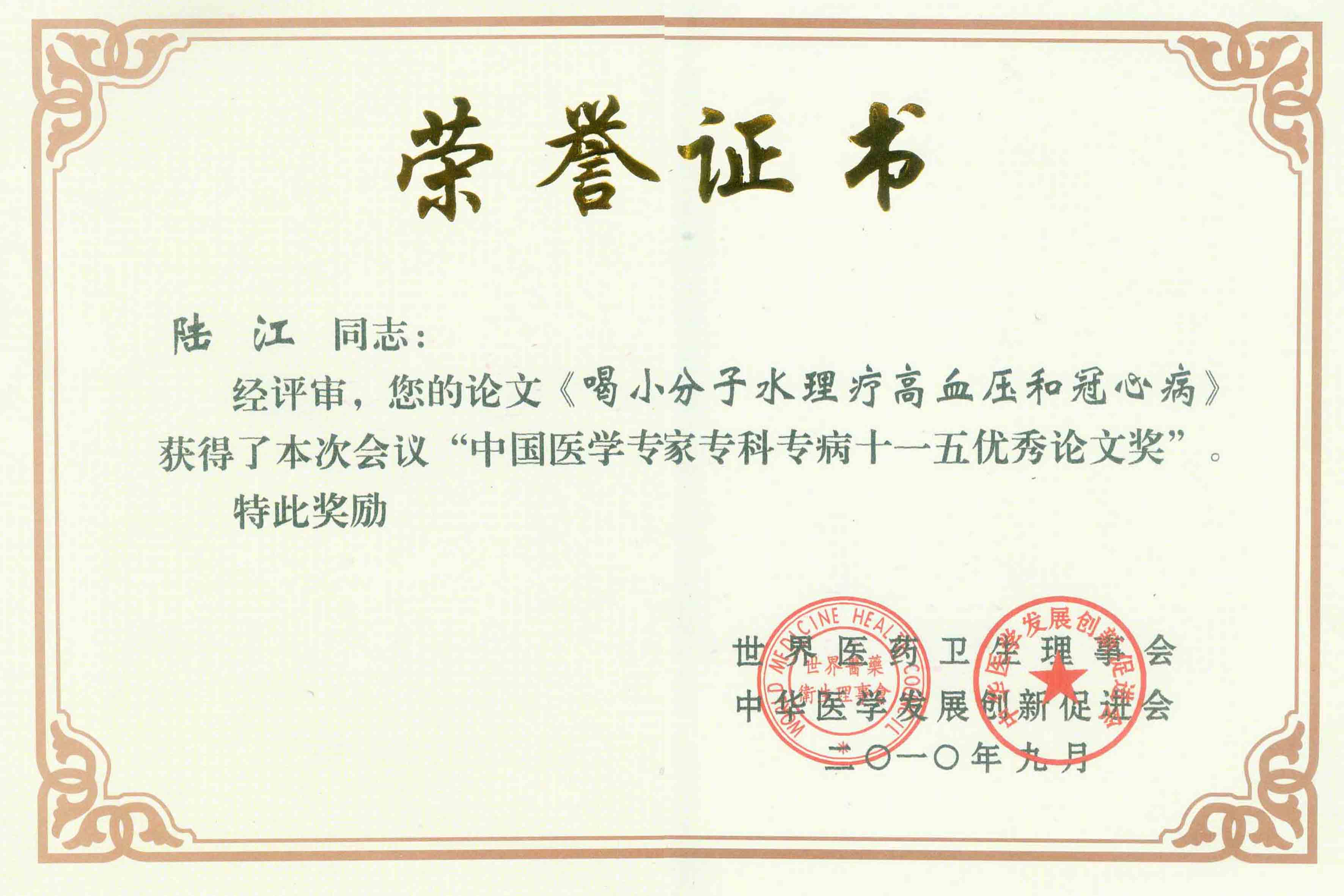 新疆63歲的賀兆生飲用一年,冠心病未愈,他用電話介紹是食堂管理員,問他食量多少?說(shuō)吃七八分飽,睡前還吃兩袋牛奶,陸 江說(shuō)我在論文和書中多次批判“吃七八分飽”,關(guān)照患者務(wù)必用“己饑方食”控制主食肉食量,要他把牛奶改在早中餐吃,減少主食肉食量,建議不吃晩餐,晚上只吃一個(gè)蘋果,再經(jīng)幾個(gè)月補(bǔ)水節(jié)食,治愈了21年的冠心病和肥胖、失眠等病,信中由衷地感激陸 江為再生父母。[13]因?yàn)獒t(yī)生從未過問他的膳食習(xí)慣,只管開處方藥或手術(shù),父母也不會(huì)叫他不吃晩飯。