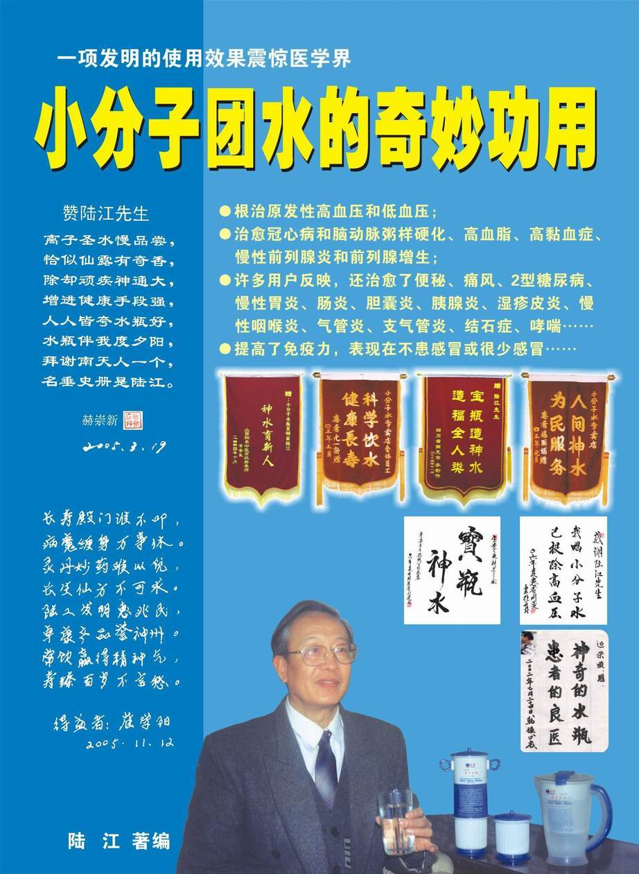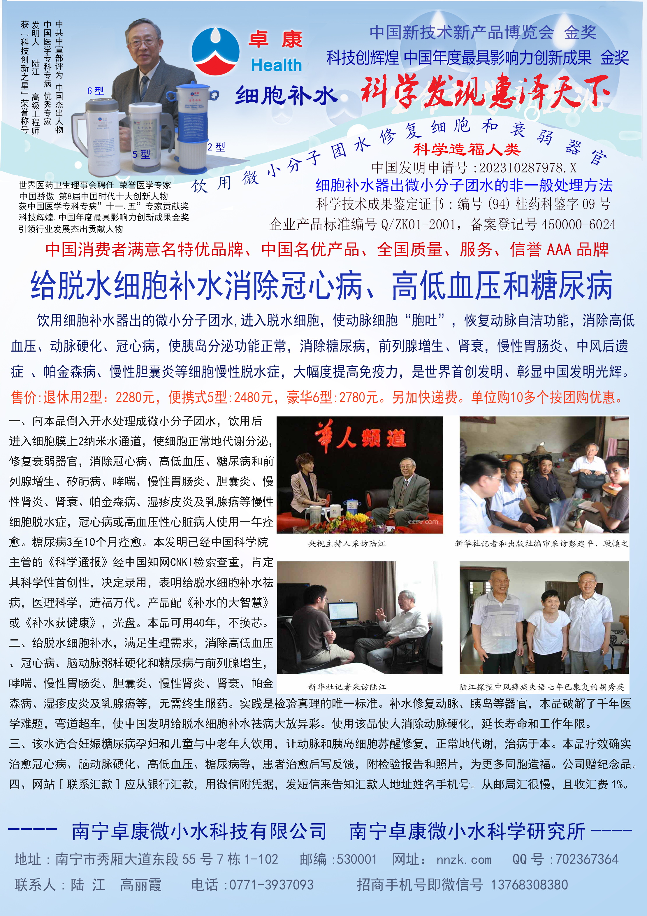 人類幾千年來(lái)患以上病癥需終生服藥,幾十年也不能治愈。可是我國(guó)南寧的高級(jí)工程師陸 江,于1990年想根治高血壓,研究發(fā)明了離子水瓶,處理出微小分子團(tuán)水供飲用,經(jīng)過醫(yī)院臨床試用和專家鑒定,1999年獲中國(guó)發(fā)明專利權(quán),產(chǎn)品于2000年投放市場(chǎng)后一直跟蹤調(diào)查,據(jù)全國(guó)各地用戶反饋:祛除了高低血壓、糖尿病和冠心病,并使前列腺增生、咽喉炎、鼻竇炎、慢性氣管炎、支氣管炎、矽肺病、哮喘、慢性胃炎、腸炎、慢性膽囊炎、慢性腎炎、腎衰、膀胱炎、便秘、痔瘡、風(fēng)濕性關(guān)節(jié)炎和濕疹皮炎及中風(fēng)后遺癥等病癥不藥而愈。為什么喝微小水能治20多種病?陸 江從1991年德國(guó)科學(xué)家發(fā)現(xiàn)細(xì)胞膜水通道僅為2納米獲得啟發(fā),認(rèn)為多種器官患病是因細(xì)胞脫水,不能正常代謝和分裂增殖,才使器官細(xì)胞減少致衰弱萎縮而形成細(xì)胞缺水性病癥。22年來(lái)的實(shí)踐有力地支持了“細(xì)胞脫水致病”這一重要論點(diǎn),表明喝微小水可滿足細(xì)胞的生理需求,補(bǔ)水就能祛病,是生命科學(xué)新亮點(diǎn)。